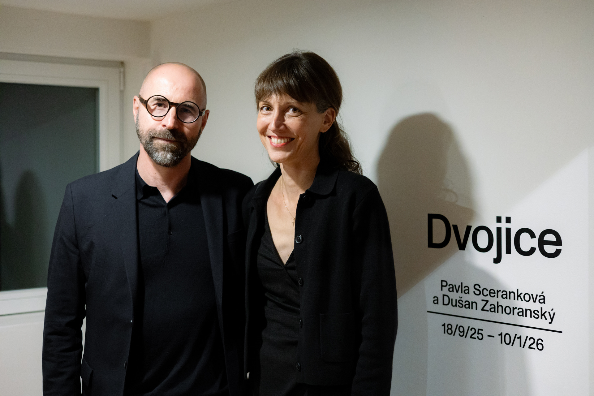 Výstavní cyklus Dvojice tematizuje partnerské soužití dvou aktivních umělců. Sochaři Pavla Sceranková a Dušan Zahoranský tvoří nejen vedle sebe, ale občas i společně. „Když jsme předloni dělali objekt Lešení pro výstavu v Litomyšli, tak jsme chodili do ateliéru na střídačku a plynule jsme navazovali jeden na druhého,“ vypráví Pavla. „Společných realizací máme jen pár, ale naše samostatné věci se dobře navzájem doprovázejí. Všechno spolu konzultujeme a většinou pak společně fungují moc dobře.“ Z jejich společných projektů lze jmenovat dětské hřiště v Litomyšli (2017), Sluneční hodiny v budově City Tower na pražské Pankráci (2024) nebo instalaci Abeceda rozkladu na festivalu v Boskovicích (2025). Největší společnou výstavu, nazvanou Práce na budoucnosti, měli před šesti lety v brněnské Fait Gallery.